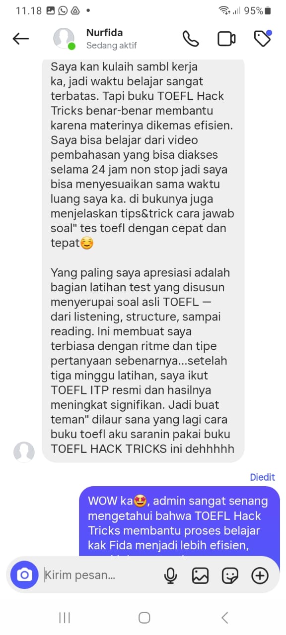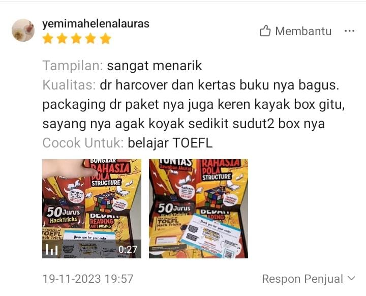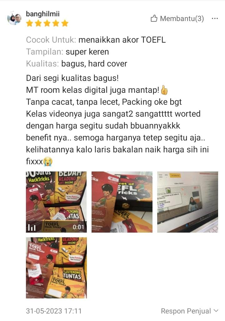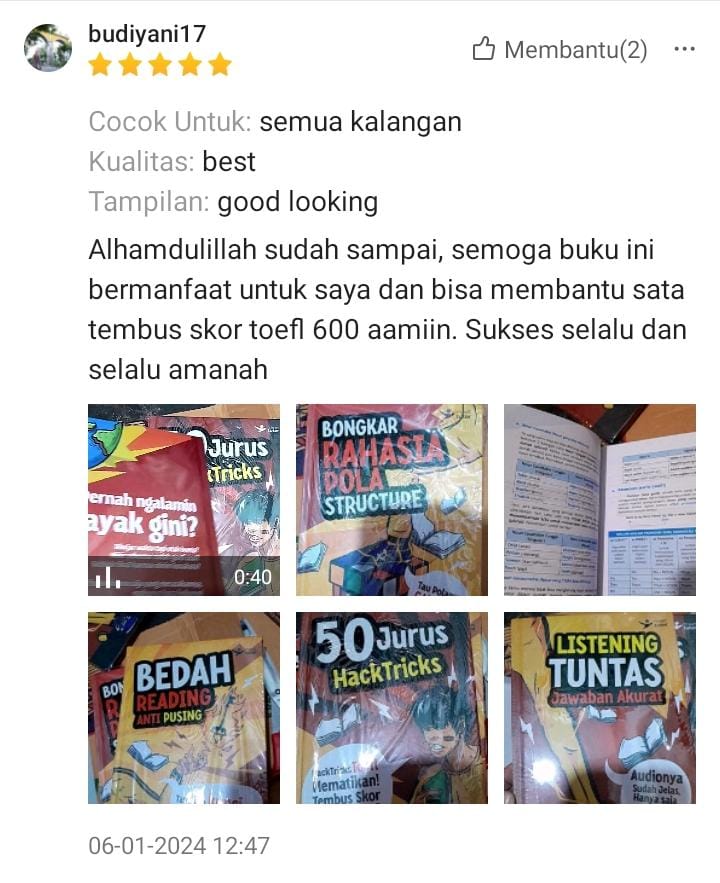 Singkat cerita habis googling, dapat buku TOEFL ini. Nahh disinilah awal mula gue optimis lagi buat belajar. Puji tuhan syukur gue bisa dapat score TOEFL 557 buat ambil S2 demi naikin jabatan gue. dari Gue yang nggak ngerti apa-apa bisa lolos. puji tuhan S2 lancar, Jabatan naik, Gaji naik.